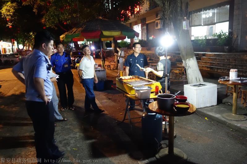 为进一步规范辖区内烧烤饮食行业经营行为,结合南宁市“蓝天保卫战”工作方案的要求,2018年6月27日晚8点,隆安县人民政府组织县住建、工商、环保、食药监及公安等相关部门对榕华街及烟草公司周边存在的露天烧烤餐饮个体经营户及个体摊位进行了联合执法检查。朱超副县长率队先后对榕华街的20个、城南街5个存在露天烧烤个体经营户、个体摊位进行了检查,对存在的跨门槛经营、顾客夜间猜码扰民、露天烧烤无组织排放油烟的的个体经营业主进行了相关法律法规的宣讲,并对其进行了批评教育。下一步将于近期对存在跨门槛经营、露天烧烤行为的个体经营业主下达“违法行为告知书”,责令限期整改上述违法行为,从而规范辖区烧烤饮食行业的经营行为,降低对周边居民的不良影响。